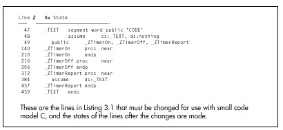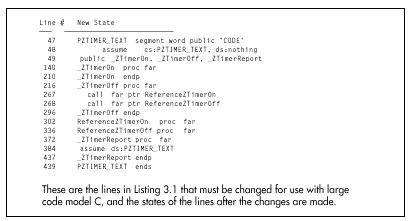 Altering the Zen timer for use in Cs large code model is a tad more complex, because in addition to the above changes, all functions, including the internal reference timing routines that are used to calculate overhead so it can be subtracted out, must be converted to far. Figure 3.3 shows the line numbers and new states of all lines from Listing 3.1 that must be changed in order to call the Zen timer from large code model C. Again, the line numbers are specific to the precision timer, but the long-period timer is very similar.