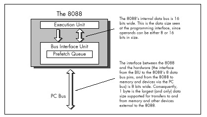 As shown in Figure 4.1, the 8-bit bus cycle-eater lies squarely on the 8088s external data bus. Technically, it might be more accurate to place this cycle-eater in the Bus Interface Unit, which breaks 16-bit memory accesses into paired 8-bit accesses, but it is really the limited width of the external data bus that constricts data flow into and out of the 8088. True, the original PCs bus is also only 8 bits wide, but thats just to match the 8088s 8-bit bus; even if the PCs bus were 16 bits wide, data could still pass into and out of the 8088 chip itself only 1 byte at a time.