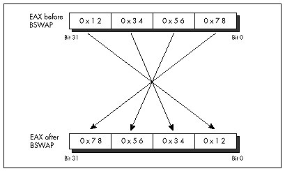 There are only 3 non-system instructions unique to the 486. None is earthshaking, but they have their uses. Consider BSWAP. BSWAP does just what its name implies, swapping the bytes (not bits) of a 32-bit register from one end of the register to the other, as shown in Figure 13.2. (BSWAP can only work with 32-bit registers; memory locations and 16-bit registers are not valid operands.) The obvious use of BSWAP is to convert data from Intel format (least significant byte first in memory, also called little endian) to Motorola format (most significant byte first in memory, or big endian), like so:
