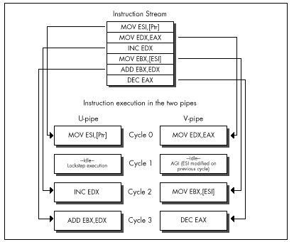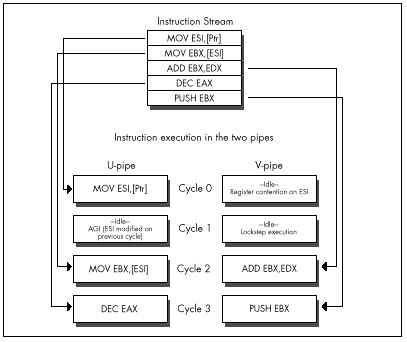 The Pentium is advertised as having a five-stage pipeline for each of its execution units. All this means is that at any given time, up to five instructions are in various stages of execution in each pipe; this overlapping of execution is done for speed, so each instruction doesnt have to wait until the previous one has finished. The only way that the Pentiums pipelining directly affects the way you program is in the areas of AGIs and register dependencies.