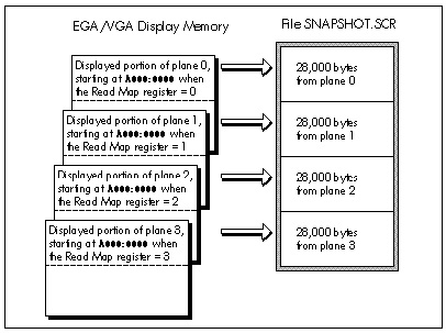 The only part of Listing 29.1 thats even remotely tricky is the use of the Read Map register (Graphics Controller register 4) to make each of the four planes of display memory readable in turn. The same code is used to write 28,000 bytes of display memory to disk four times, and 28,000 bytes of memory starting at A000:0000 are written to disk each time; however, a different plane is read each time, thanks to the changing setting of the Read Map register. (If this is unclear, refer back to Figure 29.1; you may also want to reread Chapter 28 to brush up on the operation of the Read Map register in particular and reading EGA and VGA memory in general.)