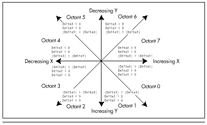 ![]() | A moment of thought will show, however, that four of the line orientations are redundant. Each of the four orientations for which DeltaY, the Y component of the line, is less than 0 (that is, for which the line start Y coordinate is greater than the line end Y coordinate) can be transformed into one of the four orientations for which the line start Y coordinate is less than the line end Y coordinate simply by reversing the line start and end coordinates, so that the line is drawn in the other direction. EVGALine does this by swapping (X0,Y0) (the line start coordinates) with (X1,Y1) (the line end coordinates) whenever Y0 is greater than Y1. |