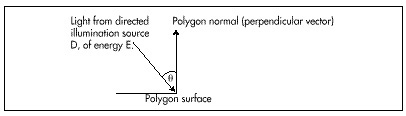 Diffuse shading is more complicated than ambient shading, because the effective intensity of directed light falling on a surface depends on the angle at which it strikes the surface. According to Lamberts law, the light energy from a directed light source striking a surface is proportional to the cosine of the angle at which it strikes the surface, with the angle measured relative to a vector perpendicular to the polygon (a polygon normal), as shown in Figure 54.1. If the red intensity of directed light is IDred, the red reflectance of the surface is Rred, and the angle between the incoming directed light and the surfaces normal is theta, then the displayed red diffuse shading for that surface, as a fraction of the largest possible red intensity, is min (IDred×Rred×cos(θ), 1).