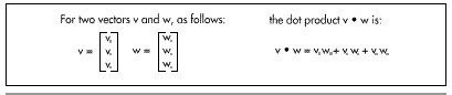Thats easy enough to calculatebut seemingly slow. Determining the cosine of an angle can be sped up with a table lookup, but theres also the task of figuring out the angle, and, all in all, it doesnt seem that diffuse shading is going to be speedy enough for our purposes. Consider this, however: According to the properties of the dot product (denoted by the operator , as shown in Figure 54.2), cos(q)=(vw)/ |v| × |w| ), where v and w are vectors, q is the angle between v and w, and |v| is the length of v. Suppose, now, that v and w are unit vectors; that is, vectors exactly one unit long. Then the above equation reduces to cos(q)=vw. In other words, we can calculate the cosine between N, the unit-normal vector (one-unit-long perpendicular vector) of a polygon, and L', the reverse of a unit vector describing the direction of a light source, with just three multiplies and two adds. (Ill explain why the light-direction vector must be reversed later.) Once we have that, we can easily calculate the red diffuse shading from a directed light source as min(IDred×Rred×(L' N), 1) and likewise for the green and blue color components.
