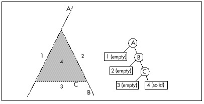 Johns original Quake design was to draw front-to-back, using a second BSP tree to keep track of what parts of the screen were already drawn and which were still empty and therefore drawable by the remaining polygons. Logically, you can think of this BSP tree as being a 2-D region describing solid and empty areas of the screen, as shown in Figure 64.4, but in fact it is a 3-D tree, of the sort known as a beam tree. A beam tree is a collection of 3-D wedges (beams), bounded by planes, projecting out from some center point, in this case the viewpoint, as shown in Figure 64.5.